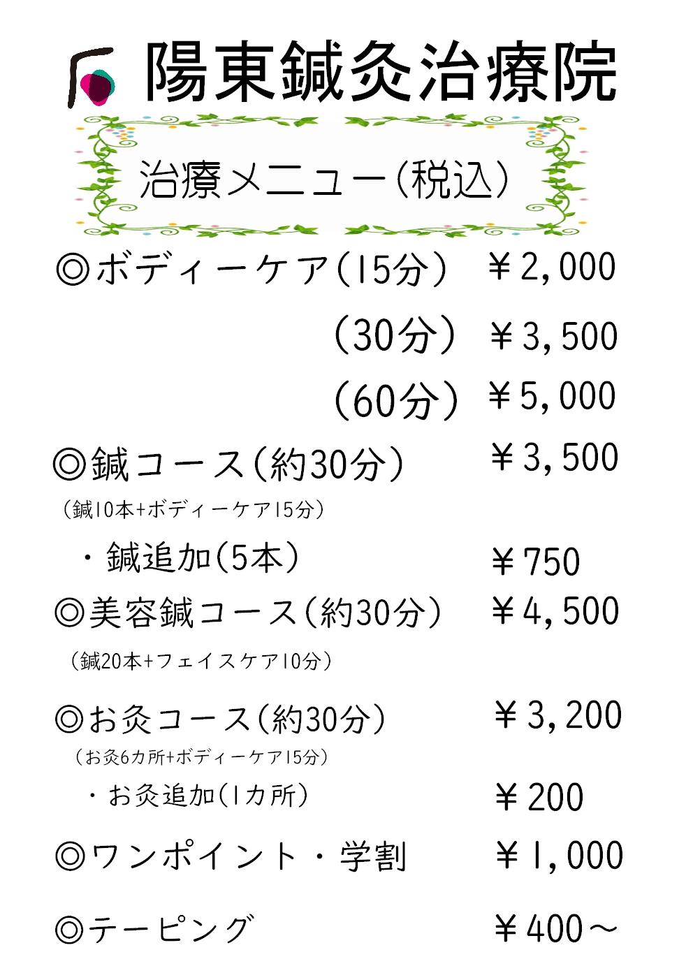 ※ (鍼・灸・ボディーケア・テーピング)をご希望の場合や、施術に関するご要望(強め・弱め)がございましたら、ご予約の際にお伝えください。また、現在の症状も簡単にお伝えいただけると助かります。